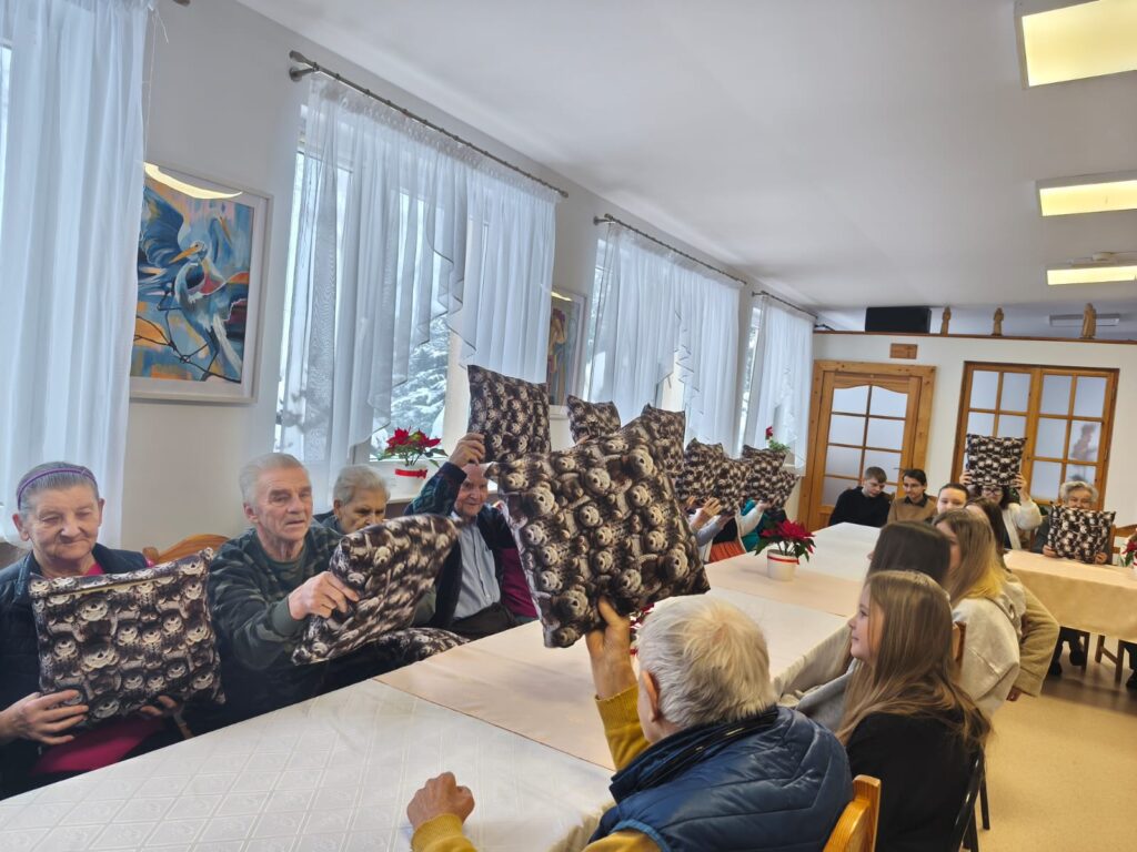 Najbardziej wzruszającym momentem wizyty było wręczenie Seniorom wyjątkowych upominków. Uczestnicy projektu podarowali mieszkańcom domu własnoręcznie uszyte poduszeczki, które powstały przy nieocenionym wsparciu pani Marioli Czaplickiej.