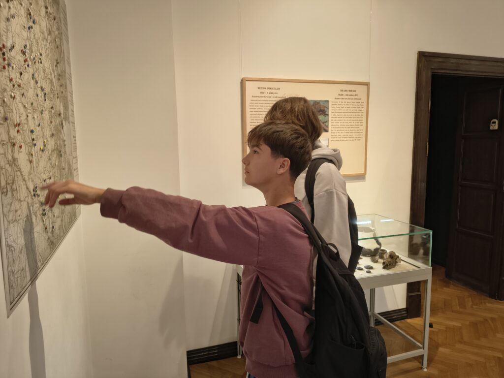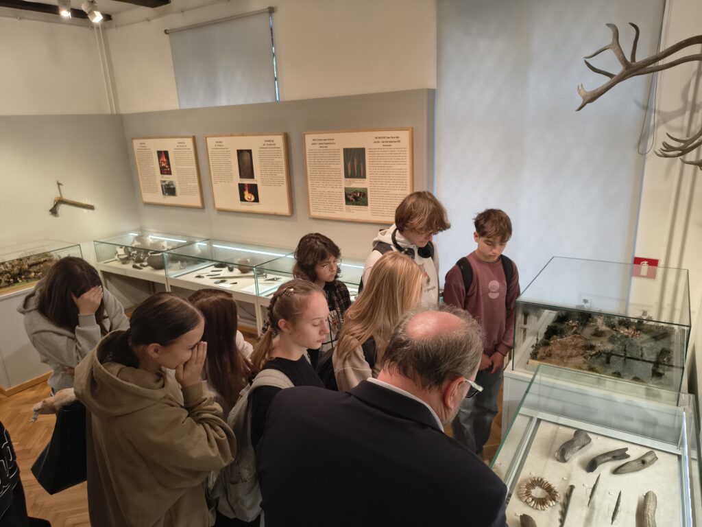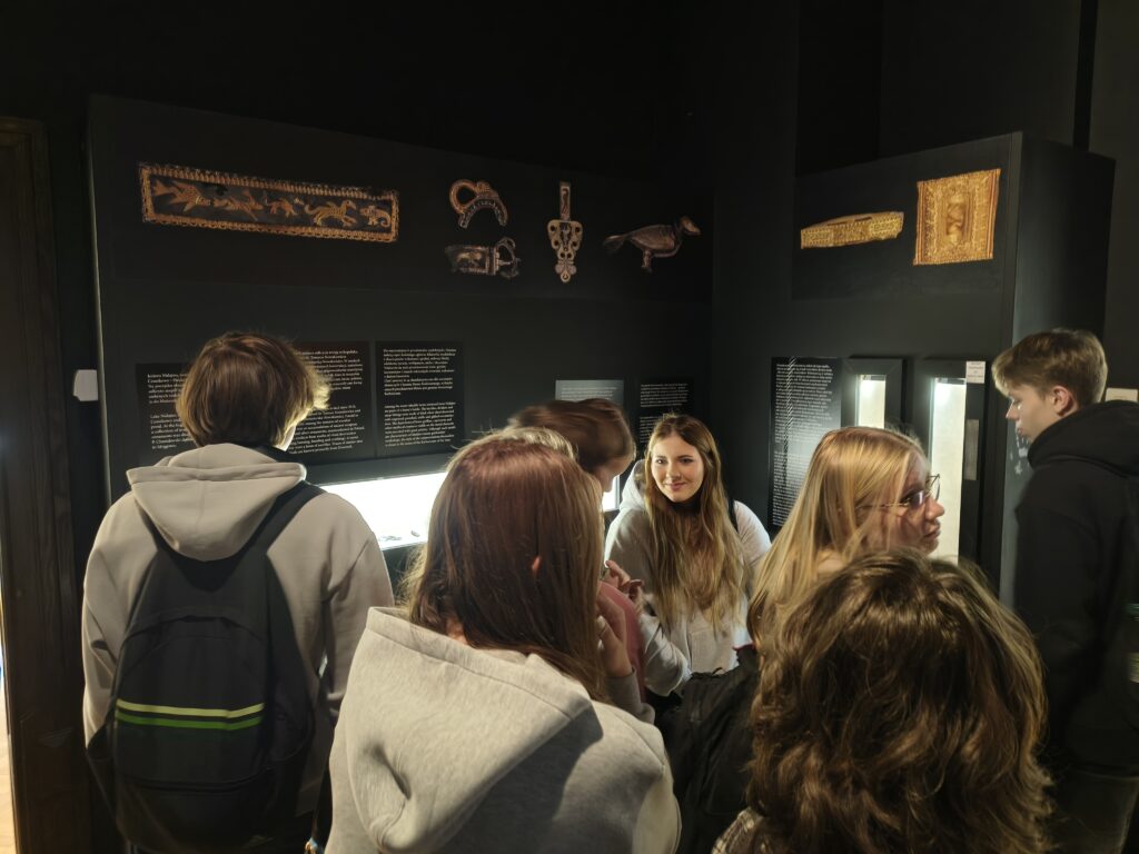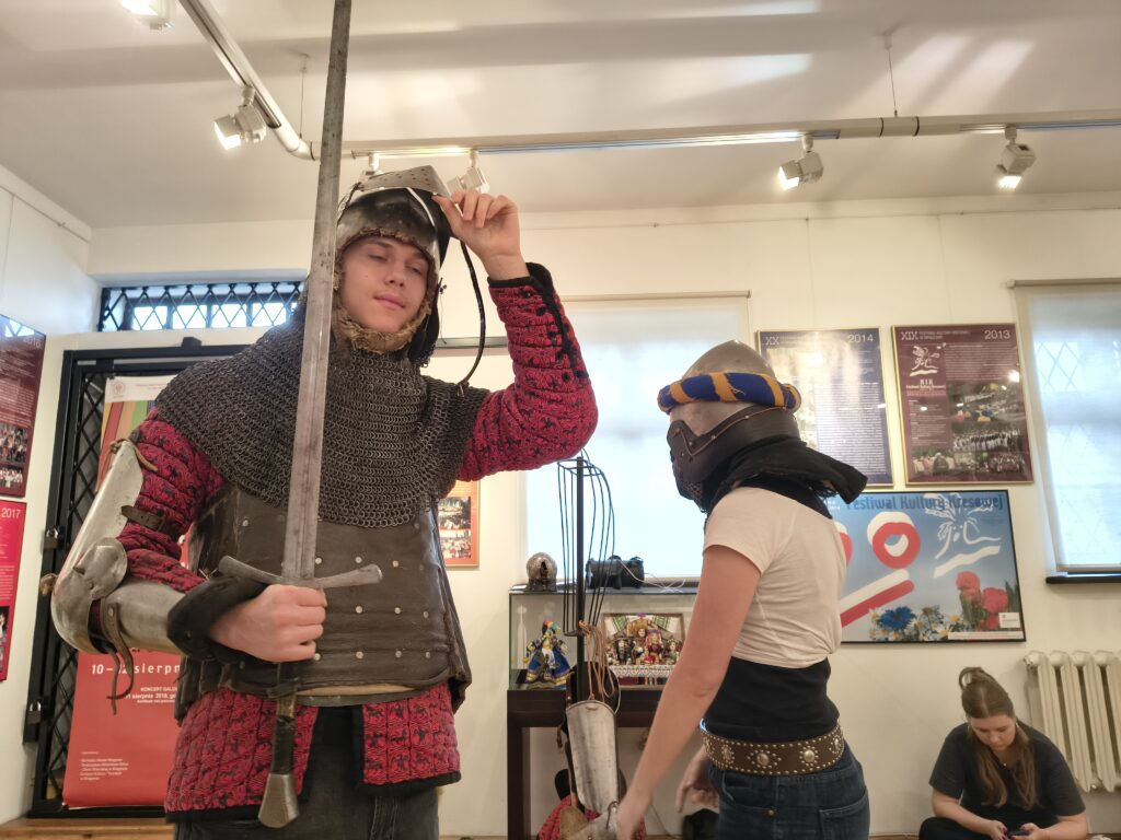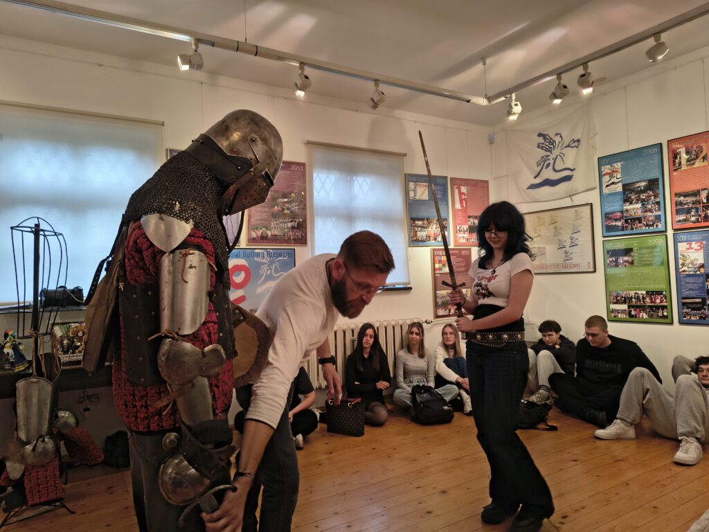 Podczas bardzo aktywnych zajęć, uczniowie zostali oprowadzeni po wystawach stałych placówki przez jej kierownika Klaudiusza Woźniaka oraz uczestniczyli w prelekcji nestora mrągowskiego ruchu rekonstrukcyjnego p. Tomasza Wasilewskiego. Osobiście mogli przekonać się o ciężarze i mobilności zbroi rycerskiej, a także mieli możliwość uczestniczenia w zabawach i tańcach prosto z epoki średniowiecza. Wizyta w muzeum z pewnością wzbogaciła wiedzę o temacie którego dotyczy projekt i ułatwi w przyszłości zrozumienie wielu odkrywanych podczas badań kontekstów historii.